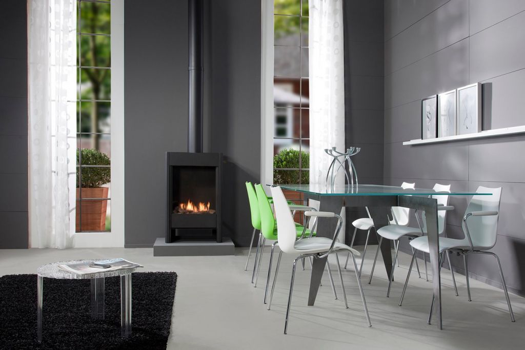 Farum est un poêle à gaz en acier noir au design simple et épuré.