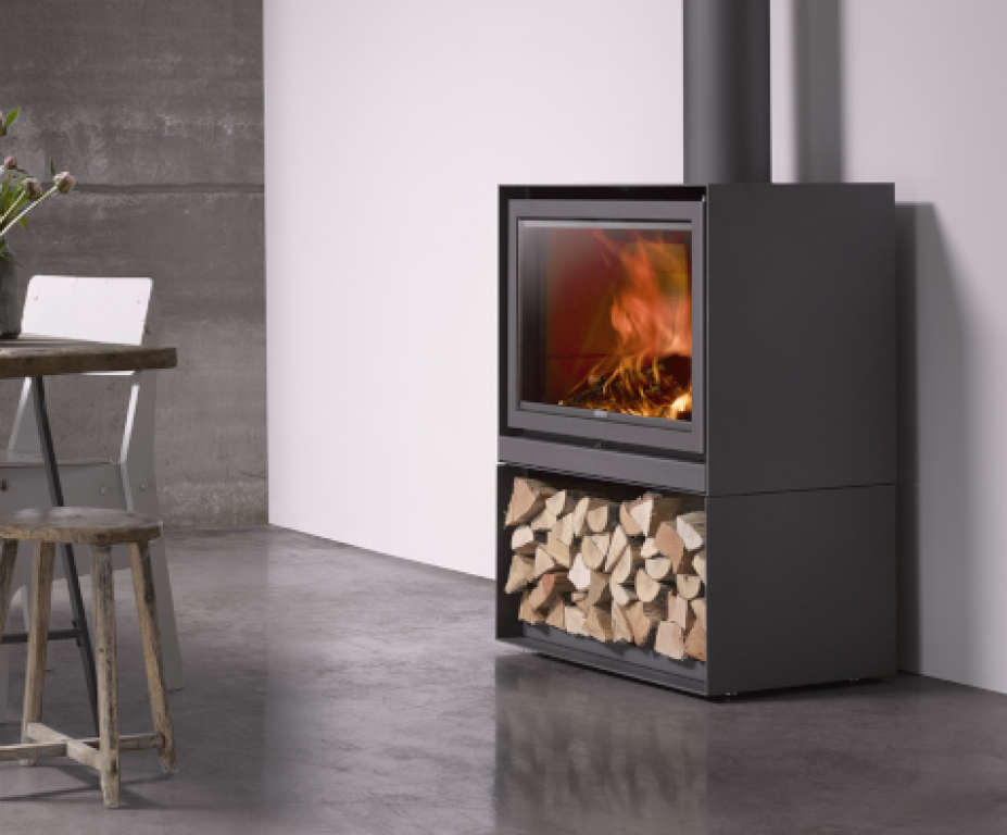 Avec son design sobre et épuré, et sa réserve de bûches intégrée, ce poêle à bois existe en trois largeurs :