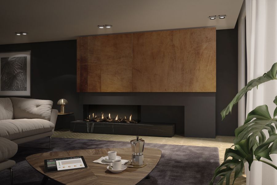 Le modèle modulable à trois faces fournit un feu propice à l’inspiration dont vous pouvez profiter de tous les coins de la pièce. Il existe avec des branchages naturels ou des lits de pierre Carrara et dans une version au gaz naturel ou LPG.