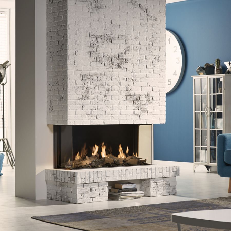 C'est un foyer à gaz d’un mètre de large avec une fenêtre à trois côtés offrant une vue imprenable sur les flammes. Des bûches, pierres ou verres anthracite sont disponibles. Les intérieurs livrables existent en noir ou Ceraglass vitrifié.