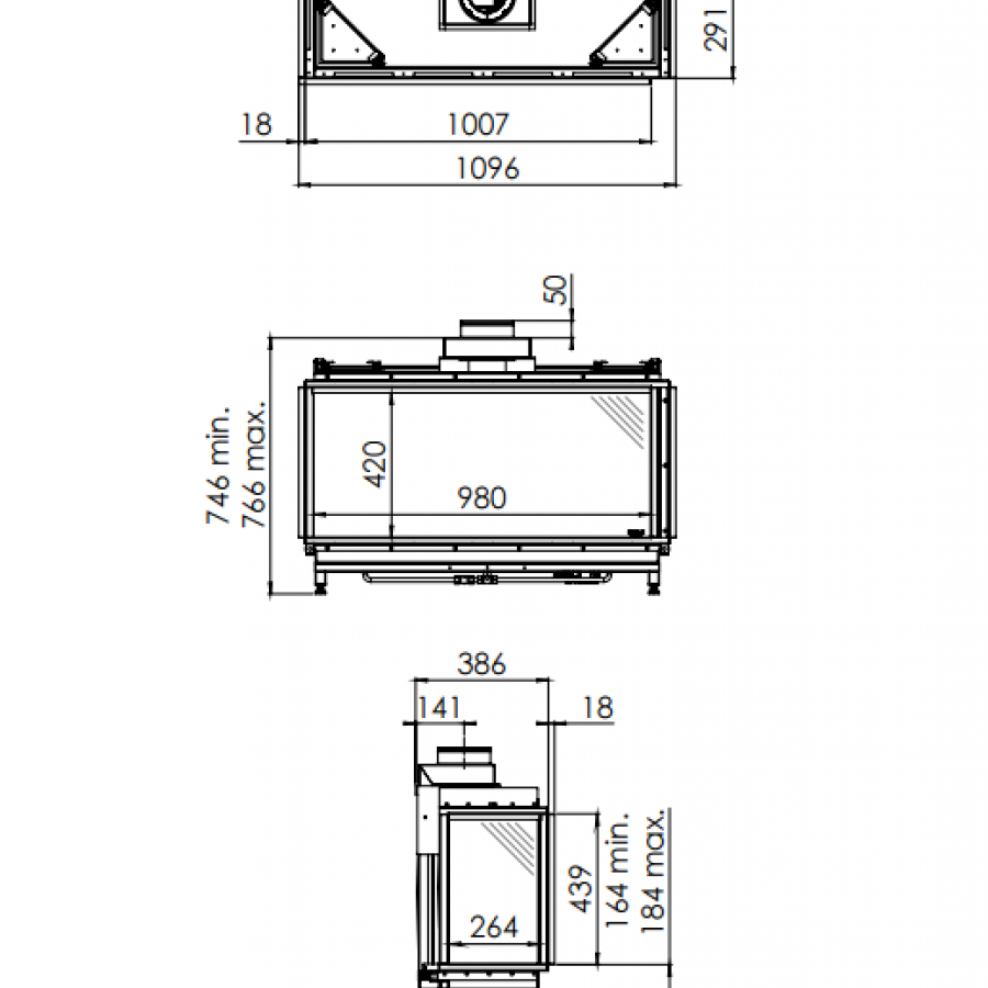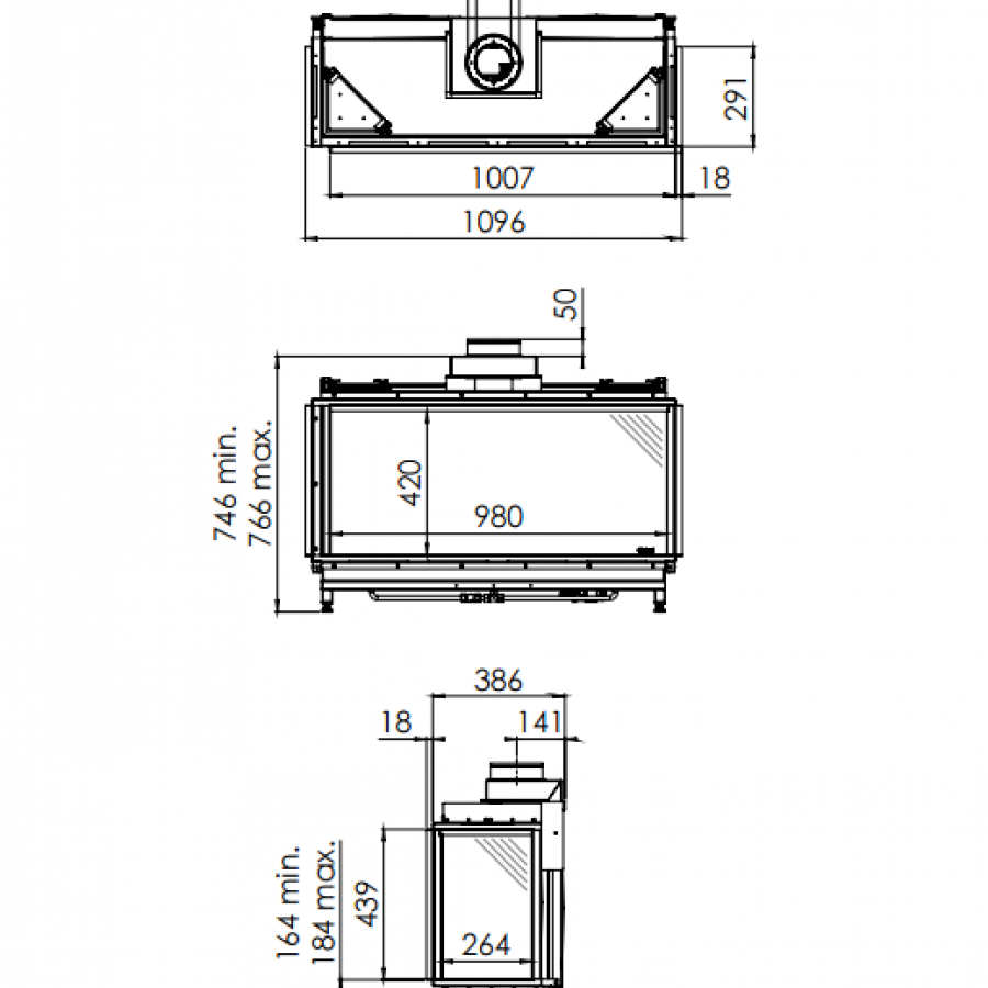 Direct Flue Directement sur le foyer avec coude 90° vers l'extérieur