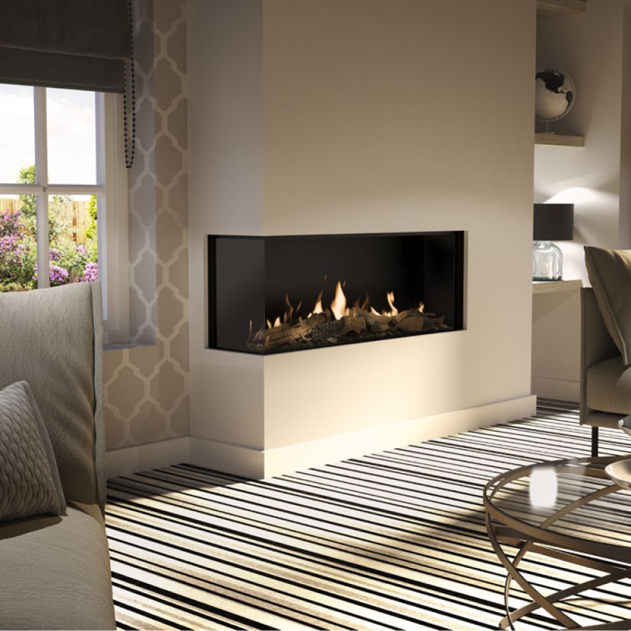 Le Global 120 Corner BF est un foyer à gaz d’ 1,2 mètre de large classique et contemporain avec une partie retournée qui lui donne une dimension supplémentaire. Il présente des bûches inspirantes, des pierres ou du verre anthracite. Sa grande porte en verre lui permet d’être installé à différents endroits comme des parois de séparation de pièce.