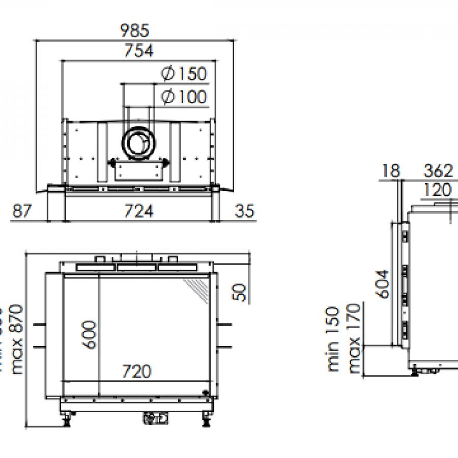 Direct flue, foyer avec coude à 90° vers l'extérieur