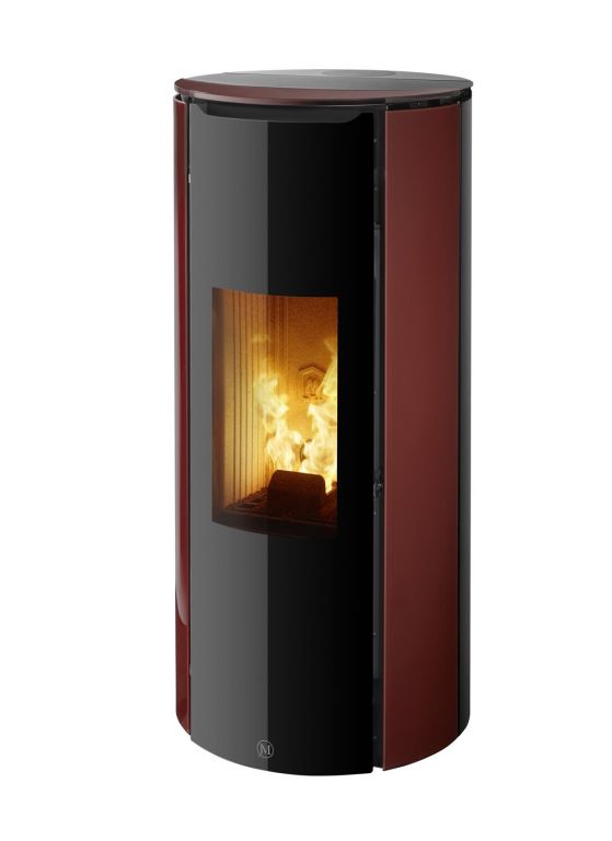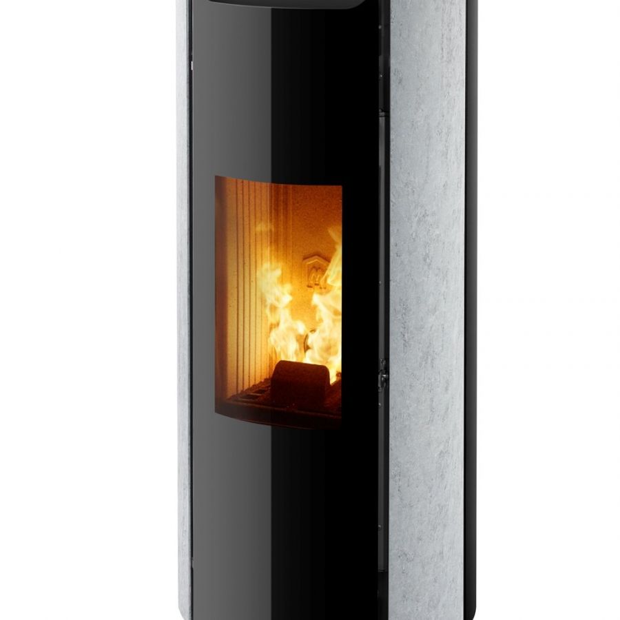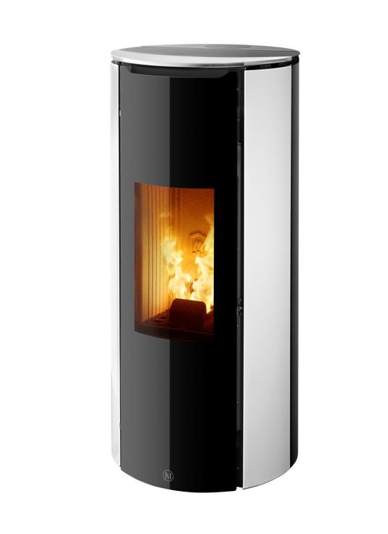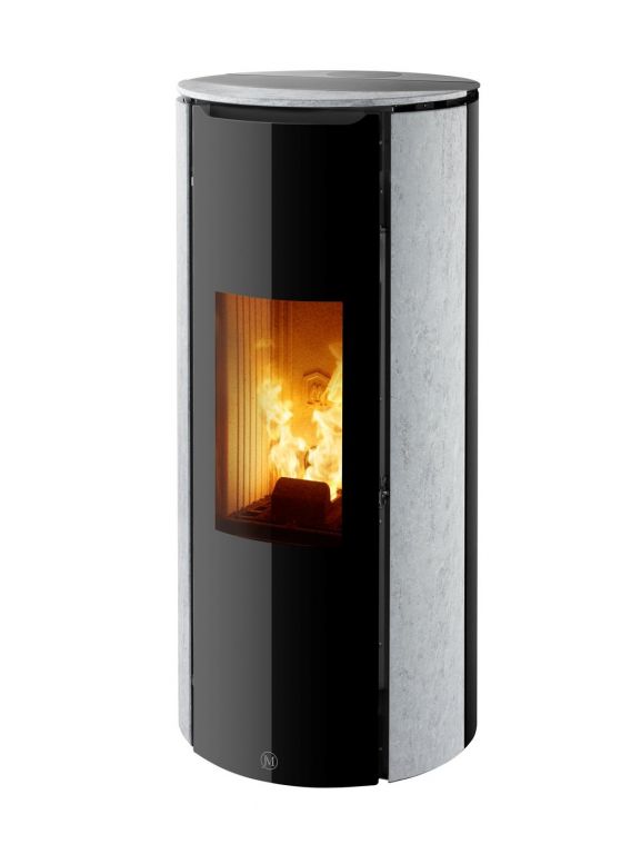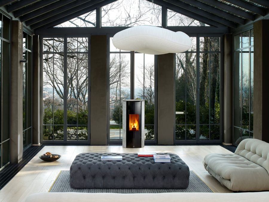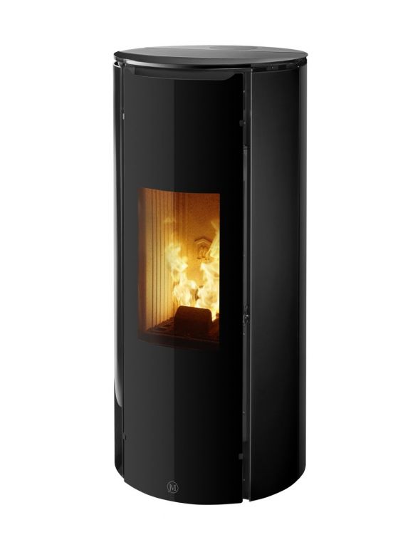 Poêle à granulés au design épuré sans grille de ventilation apparente.