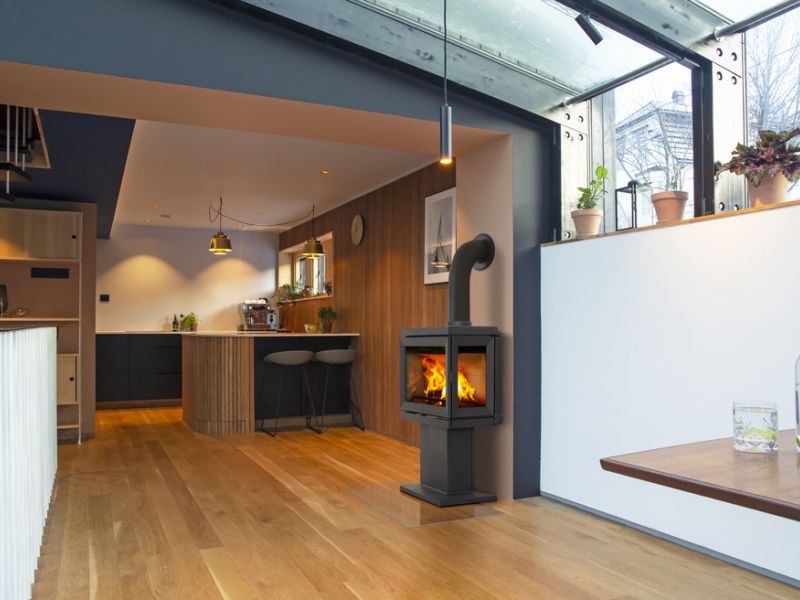 Un poêle à bois aux performances énergétiques exceptionnelles, présentant un design moderne et épuré.