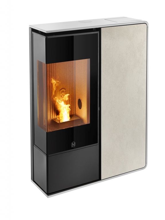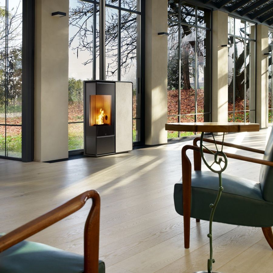 Avec sa très faible profondeur (27cm), le poêle à pellets I-Dea 2 Angolo se prête au jeu de tous les intérieurs.
