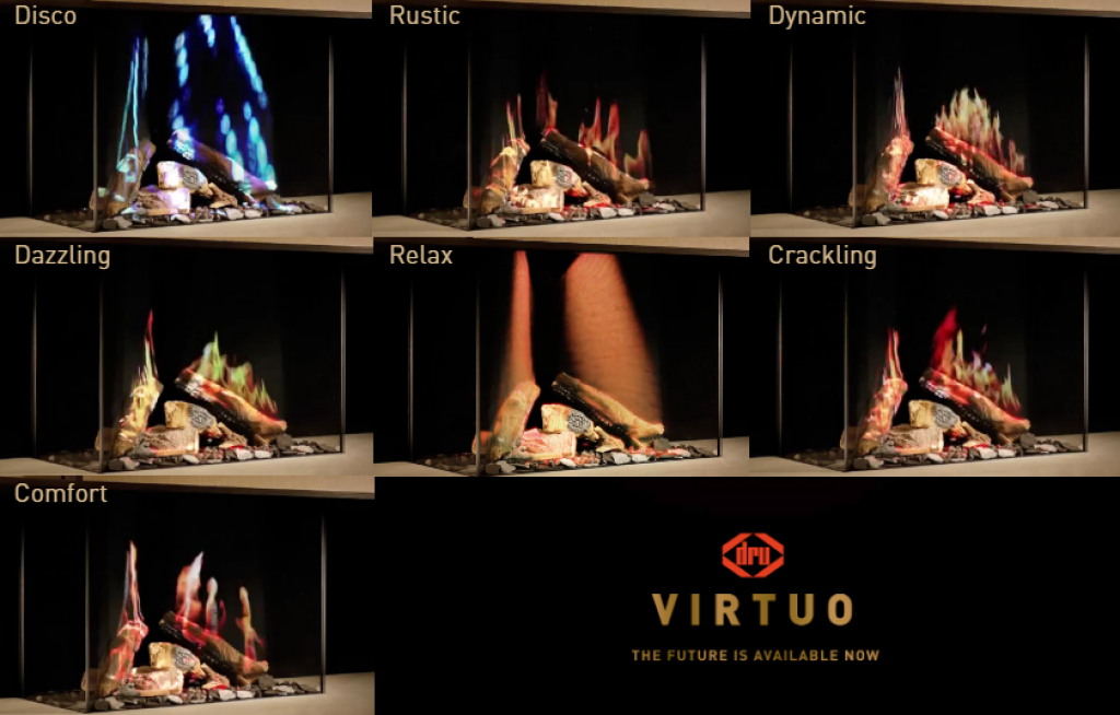 Le DRU Virtuo n'est pas seulement un feu électrique. C'est l'atmosphère et la chaleur d'une prise que vous pouvez apprécier en trois dimensions. Grâce à la nouvelle technologie 3D avancée, DRU Virtuo permet de profiter d'une foyer d'ambiance dans tous les coins de votre pièce. En outre, vous pouvez placer la cheminée n'importe où dans la pièce où se trouve une prise électrique. Pas besoin d'installer une cheminée pour profiter de la chaleur !