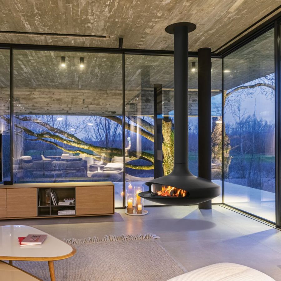 Cette cheminée suspendue, désormais équipée d'une vitre de protection, préserve la beauté des flammes tout en optimisant la sécurité et l'efficacité thermique.
