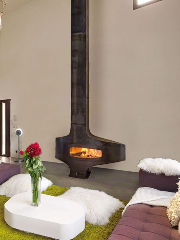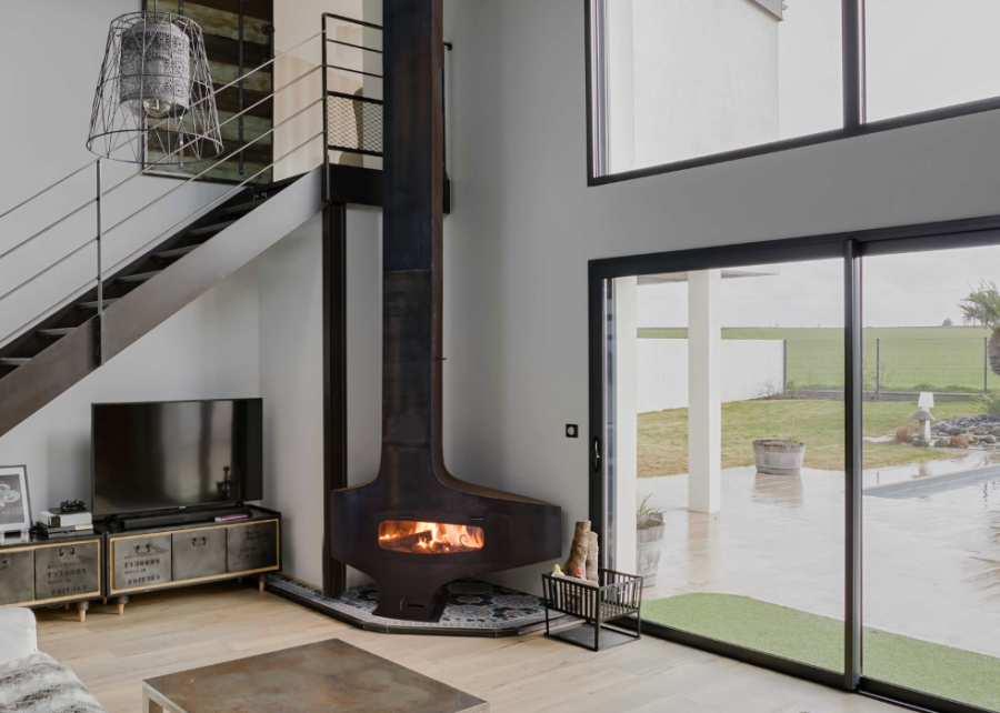 La cheminée peut fonctionner porte ouverte ou fermée, et le conduit en acier est réalisé sur mesure pour s'adapter à votre installation.