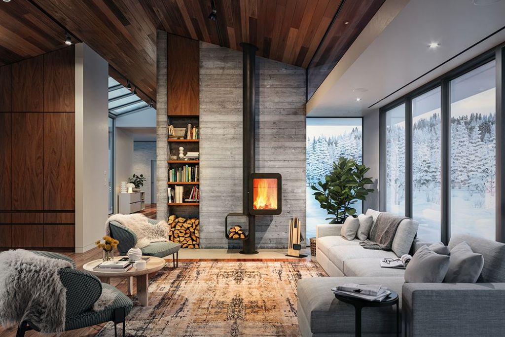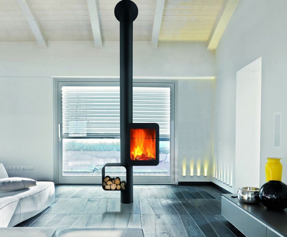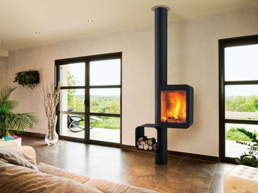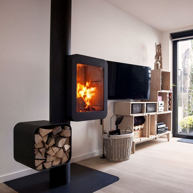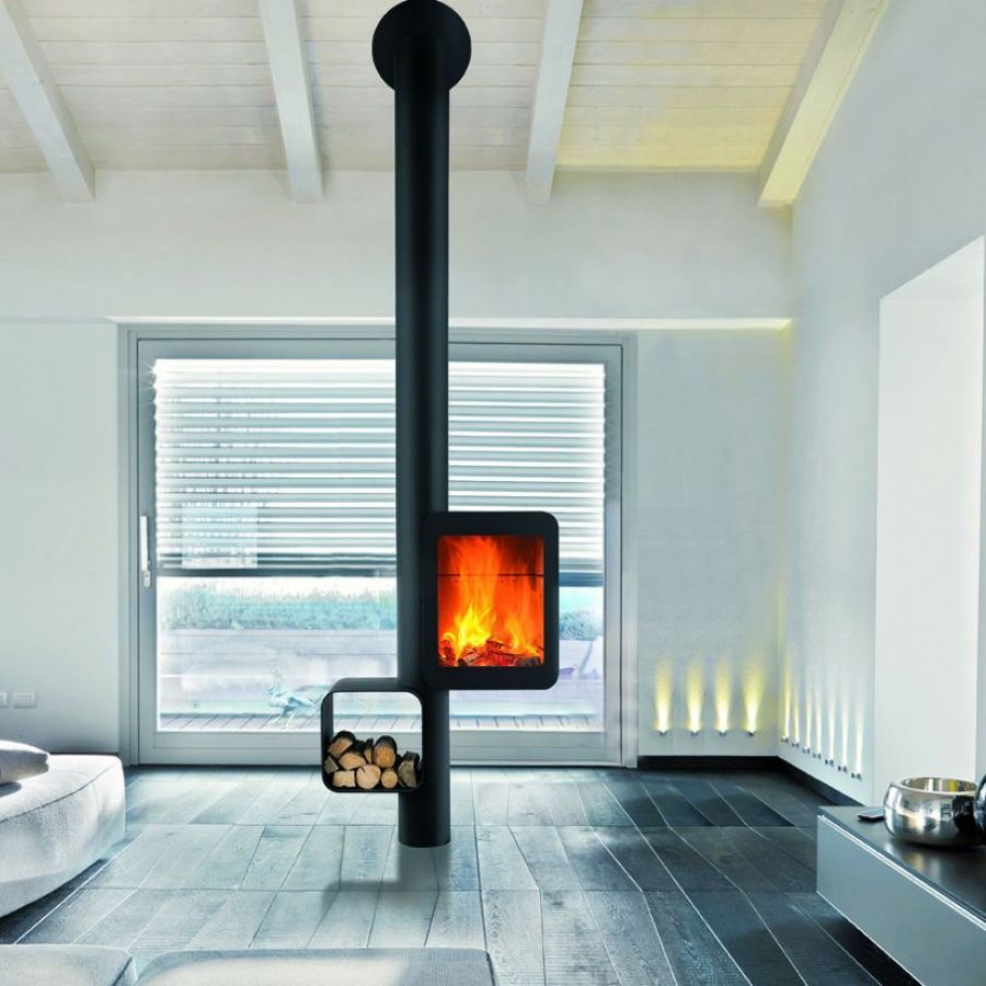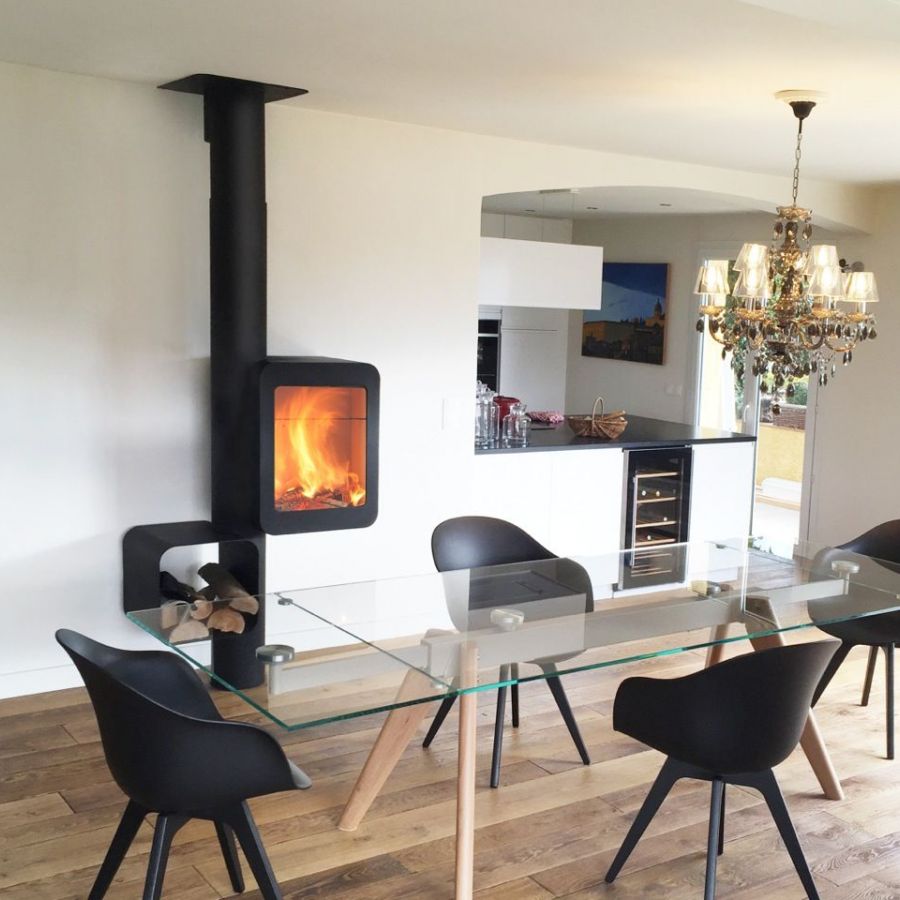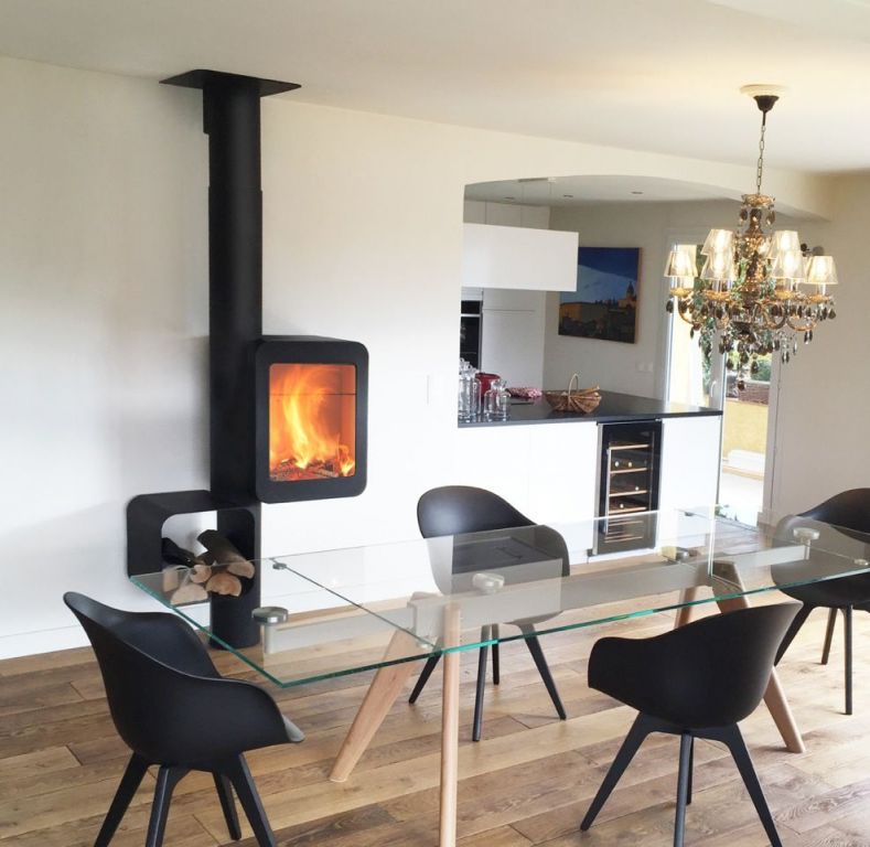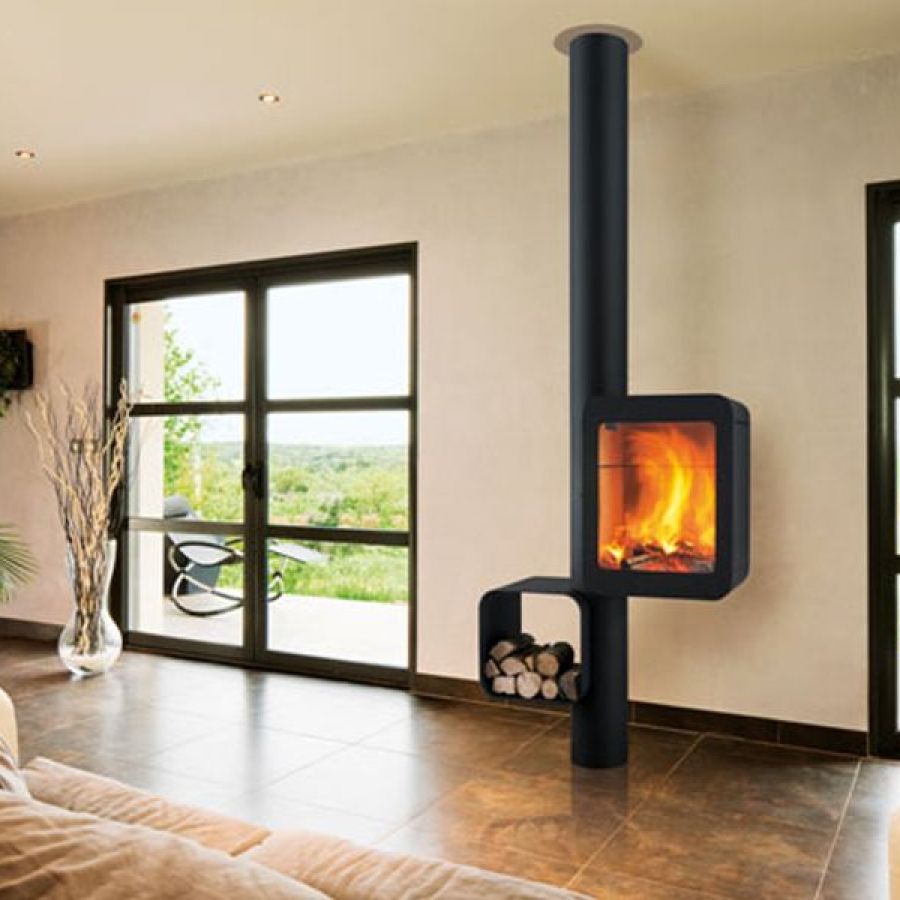 Le Grappus offre une vision panoramique des flammes, grâce à son design innovant qui intègre un présentoir à bois à proximité immédiate du foyer.