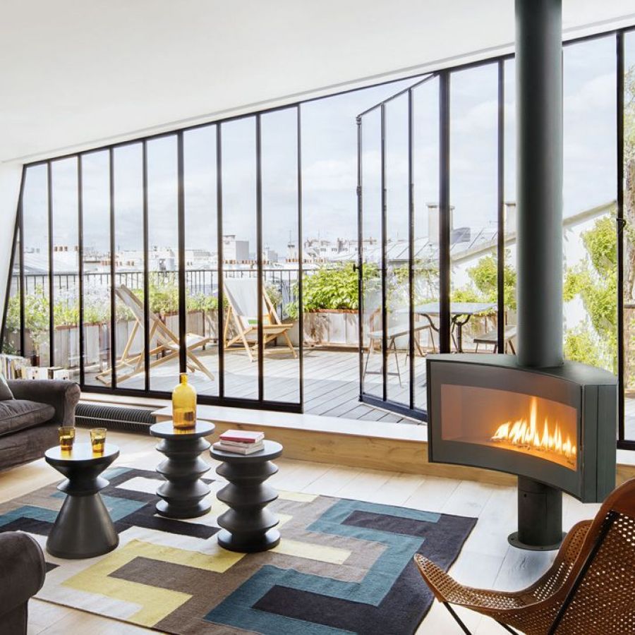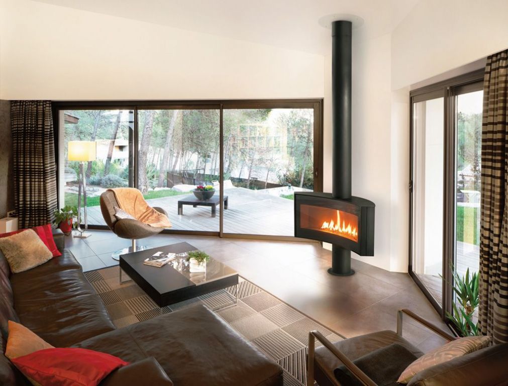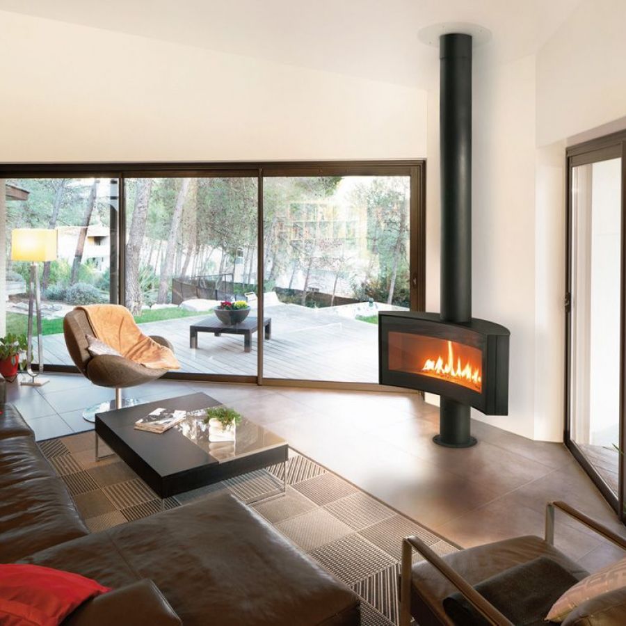 Le Curvifocus est équipé d'un brûleur à gaz télécommandé certifié CE et d'un foyer fermé à ventouse, compatible avec la RT 2012 et les maisons à basse consommation d'énergie (BBC).