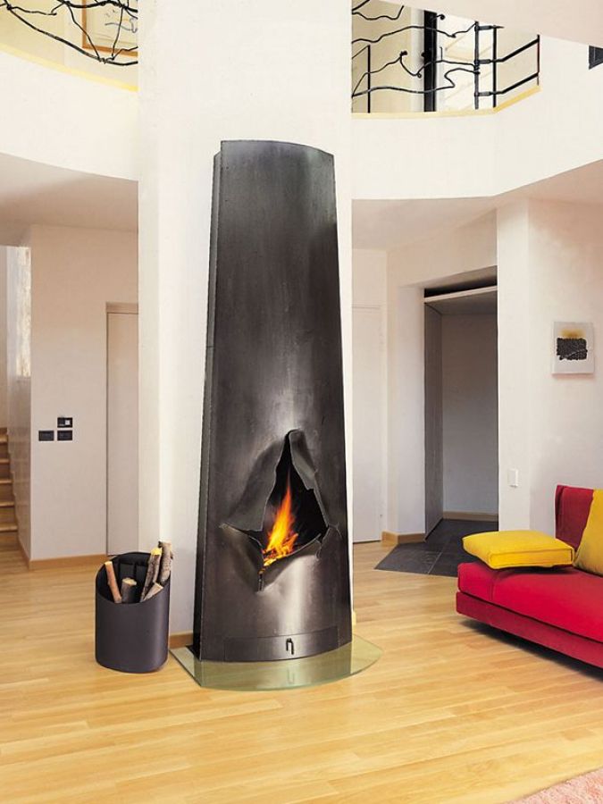 La cheminée murale Magnifocus Éclaté de Focus est une sculpture fonctionnelle en acier brut ciré, créée par Dominique Imbert.