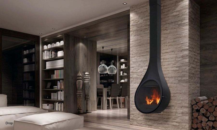 Fixé au plafond, il flotte avec légèreté dans l’espace, captant naturellement le regard et structurant la pièce avec caractère. Sa forme organique et sa vaste ouverture vitrée offrent une vue fascinante sur les flammes, tout en assurant une diffusion homogène et efficace de la chaleur.