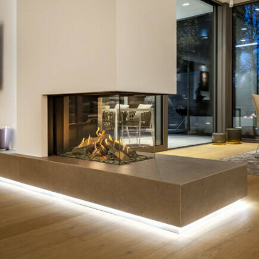 Avec sa forme atypique et sa vitre panoramique en L (856 x 400 x 550 mm), il sublime les intérieurs ouverts avec raffinement. Son intérieur plat et son contre-cadre discret sont livrés en standard, mais il peut être entièrement personnalisé : verre céramique, intérieur design, vitres antireflet, fonction hybride, ou encore le Natural Spark Generator pour un effet flamme ultra-réaliste.
