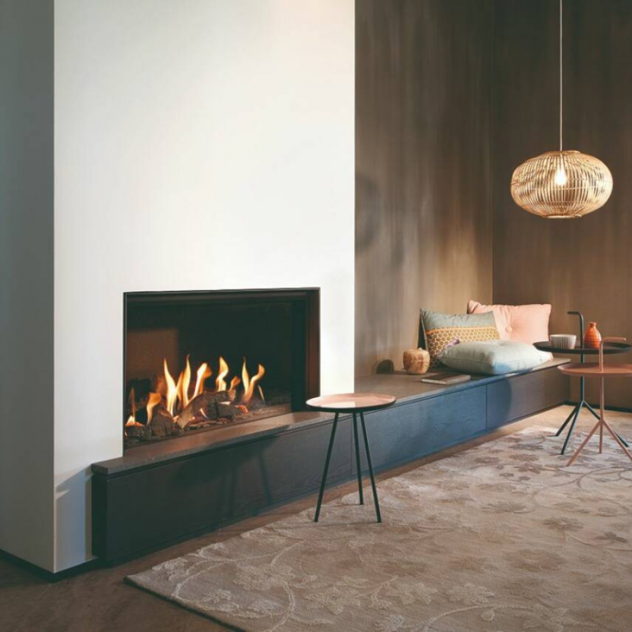 Ce modèle personnalisable permet de créer une ambiance unique : intérieur plat ou design, verre céramique ou antireflet, et remplissage au choix (bûches exclusives, cailloux blancs, gris ou cryptonite). Il allie performance et sobriété, avec une puissance modulable de 3,5 à 6,8 kW, un rendement de 82 % et un indice d’efficacité énergétique de 89 %. Un foyer idéal pour les amoureux de design discret et de confort maîtrisé.