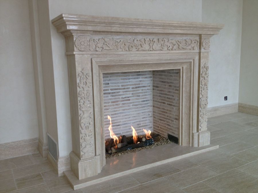 Son habillage en pierre naturelle est sublimé par des ornements délicats sur les jambages et le linteau, apportant relief et caractère à l’ensemble tout en conservant une esthétique équilibrée.