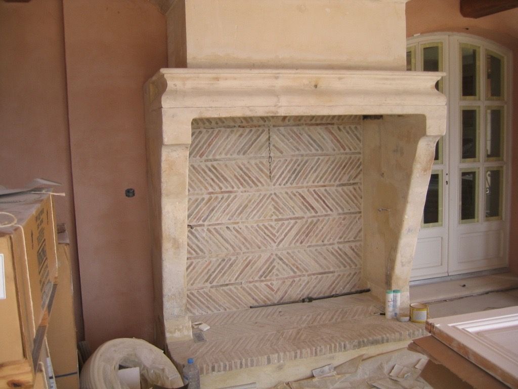 Grand foyer à bois avec fond en briquettes en chevron – Alpes-Maritimes