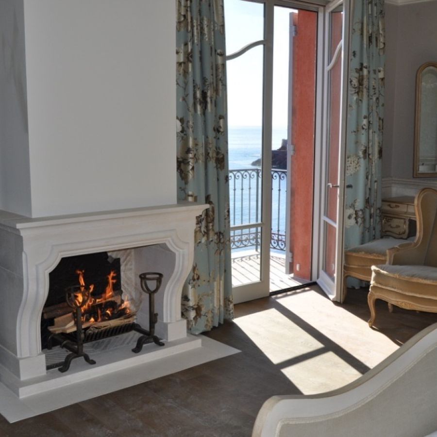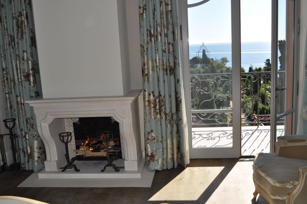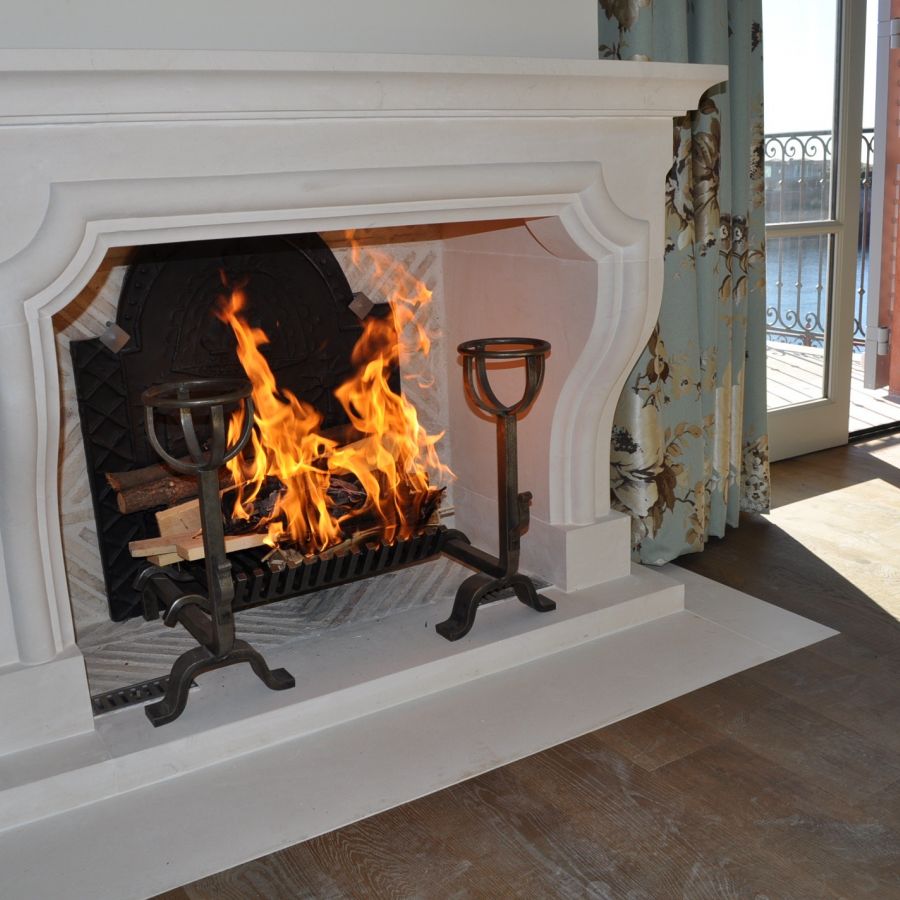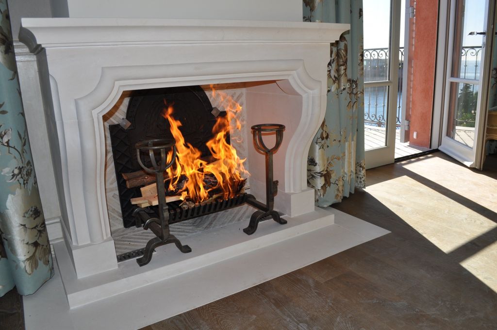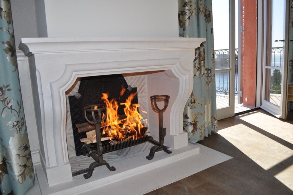 Cheminée en pierre blanche moderne avec foyer ouvert à bois – Alpes-Maritimes
