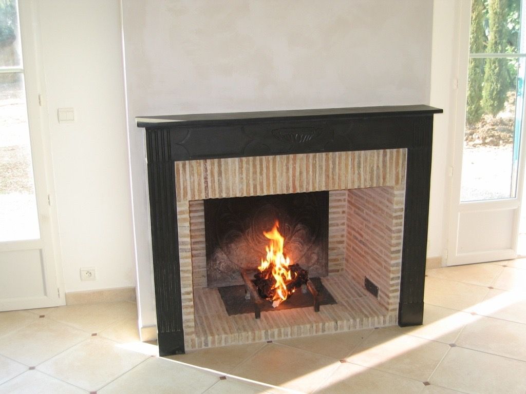 Cheminée en pierre avec linteau et jambages noirs – Foyer ouvert à bois – Alpes-Maritimes