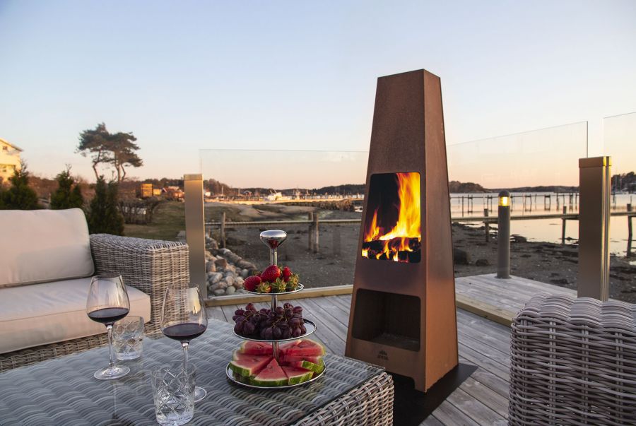Une cheminée robuste en acier corten qui peut rester dehors en toutes saisons.