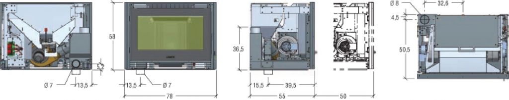 - Chauffage breveté Multifuoco System ®, avec 2 ventilateurs pouvant fonctionner séparément, 3 vitesses de ventilation programmables, possibilité de fonctionnement avec programmation de la température ambiante relevée par la télécommande, bouche de sortie d’air chaud frontale en partie basse et 1 sortie pour la distribution en partie arrière avec accessoire en option