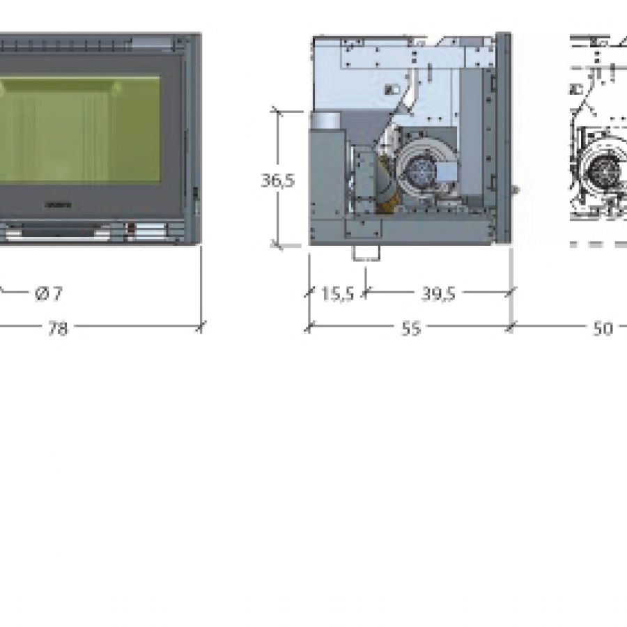 - Chauffage breveté Multifuoco System®, avec 2 ventilateurs pouvant fonctionner séparément, 3 vitesses de ventilation programmables, possibilité de fonctionnement avec programmation de la température ambiante relevée par la télécommande, bouche de sortie d’air chaud frontale en partie basse et 1 sortie pour la distribution en partie arrière avec accessoire en option