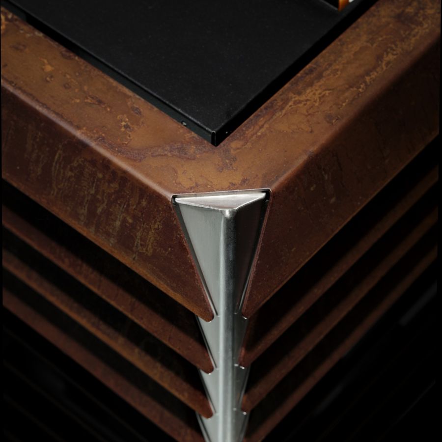 - Finitions : Acier laqué noir + coins en inox brossé, acier corten effet rouillé + coins en acier laqué noir