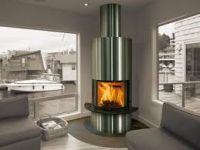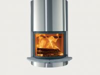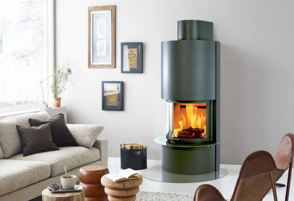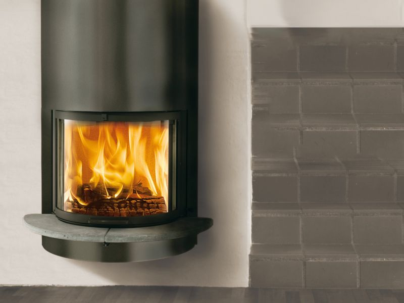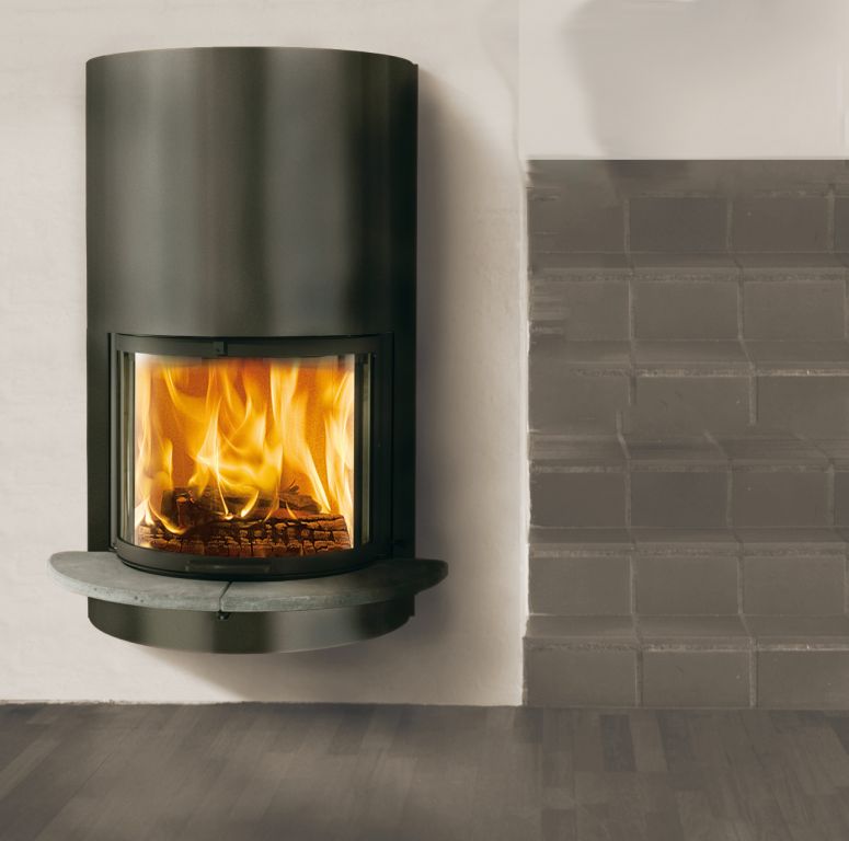 Une cheminée-poêle pleine de personnalité avec sa vitre arrondie, existant en version suspendue au mur ou posée au sol.