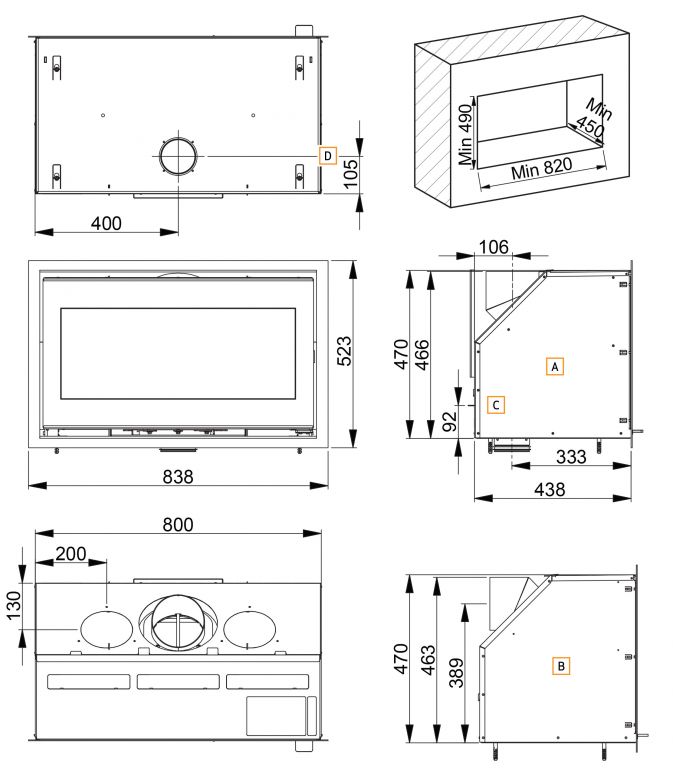 Options | Version 1006 BB = vitre sérigraphiée noire, cadre noir et poignée verre teinté noir Version 1006 WC = vitre sérigraphiée blanche, cadre chromé mat et poignée verre transparent Kit de raccordement pour prise d'air directe |