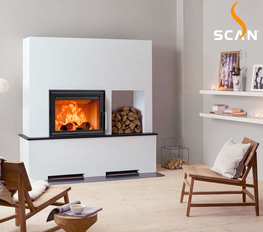 Le foyer à bois Scan 5002 est doté d'une vitre horizontale et peut accueillir des bûches de 45 cm.