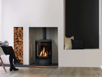 Les formes élevées et doucement courbées du poêle à gaz Loft assureront un point focal résolument contemporain dans chaque intérieur. Le verre noir réfléchissant qui entoure le foyer crée un beau contraste à l’acier noir du corps de l’appareil. De belles flammes dorées dansent parmi des bûches céramiques ultra-réalistes. Le spectacle visuel des flammes est accentué et multiplié de tous côtés par le revêtement intérieur en verre noir EchoFlamme.™