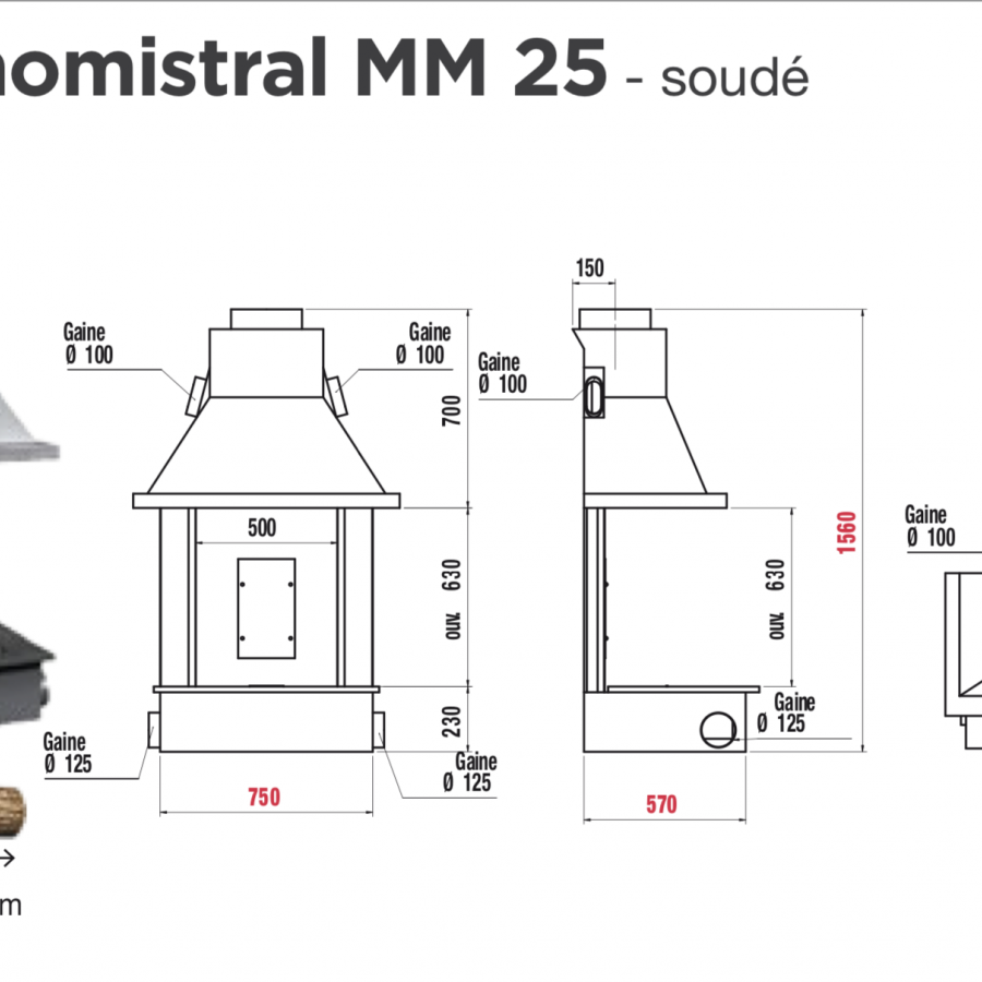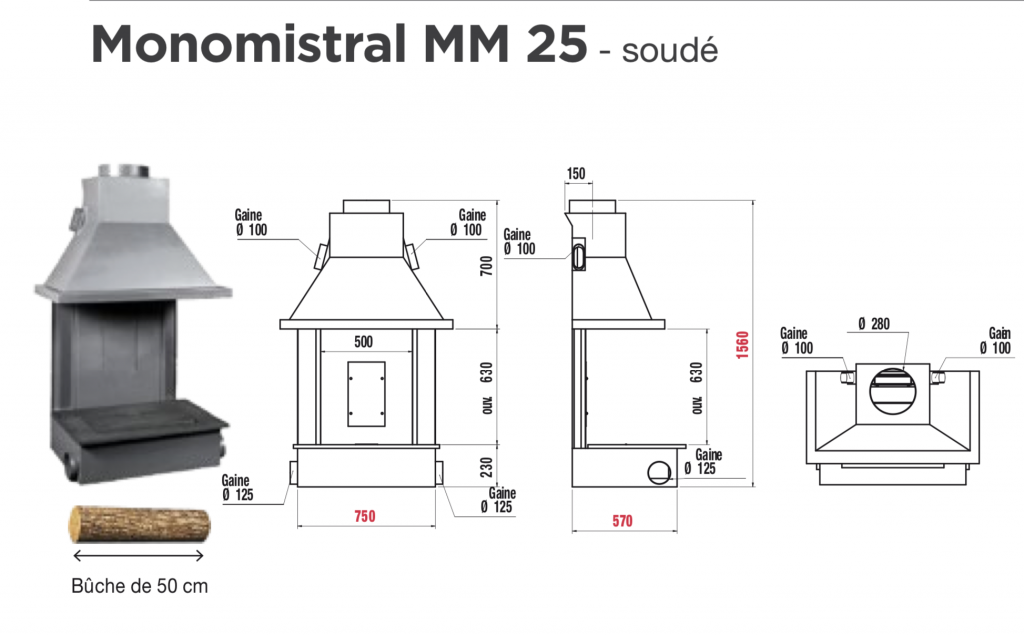 Sortie ronde diam. 280mm. Pour bûches coupées à 50 cm.