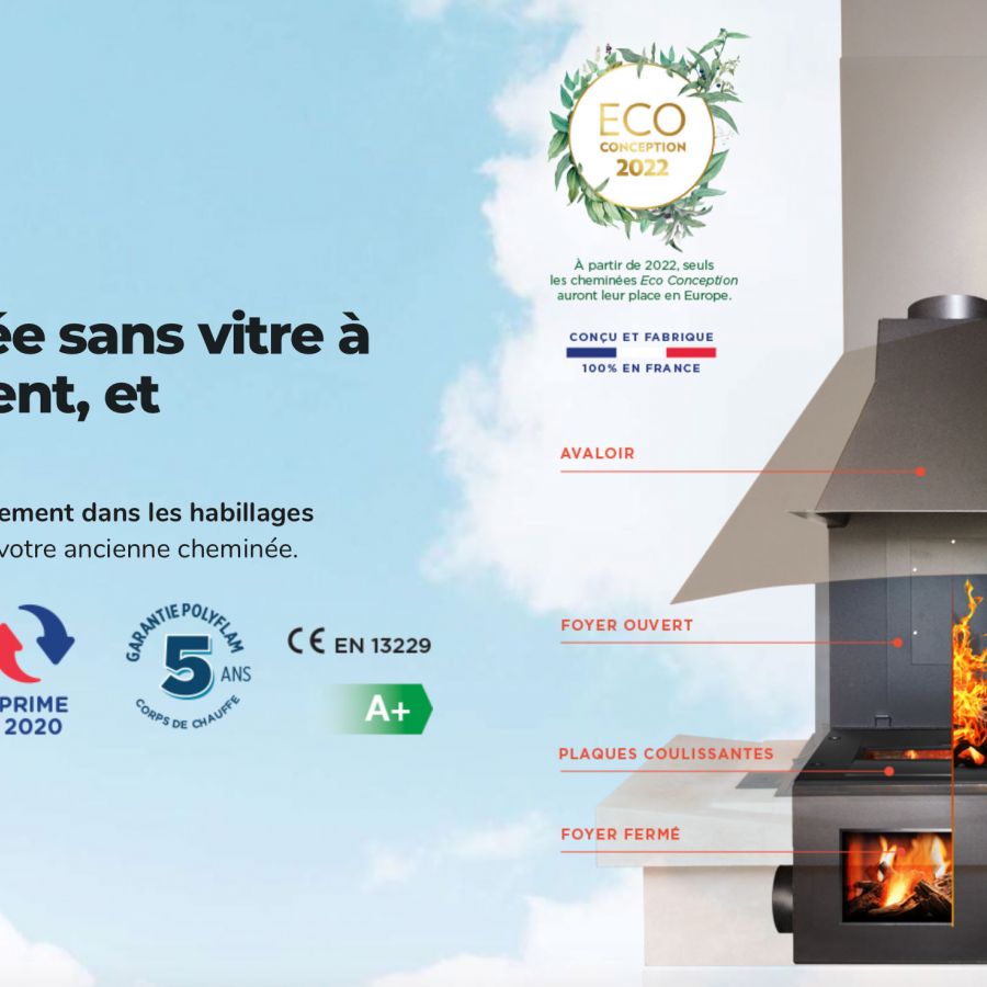 Polyflam est un système unique offrant une double fonction de feu ouvert / feu fermé : les amoureux du feu traditionnel ne perdront rien au rendement calorifique, même sans vitre !