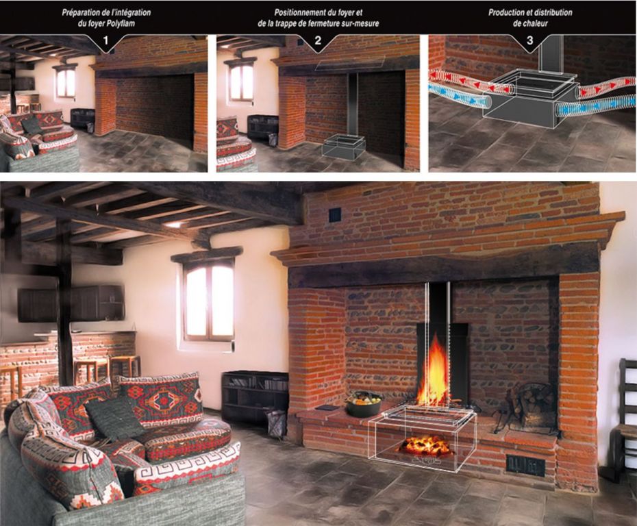 Polyflam est un système unique offrant une double fonction de feu ouvert / feu fermé : les amoureux du feu traditionnel ne perdront rien au rendement calorifique, même sans vitre !