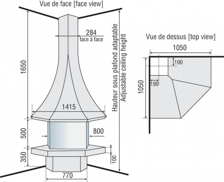Options | Version d'angle peinte - Socle briqueté ou tout métal, (épaisseur 10 cm) Socle effet ciré (couleurs : blanc cassé, noir ébène, gris, taupe, chocolat) Socle vide, (sans briques), finition à réaliser par vos soins Rehausse de socle, (20 cm maximum) Rallonge de conduit non laqué , (au-delà de 2,5 M et pour 1 M supplémentaire) Bandeau de socle laqué uni Platine cache plafond Outside air Fixation pour cheminée murale Caisse bois Transport cheminée jusqu'à 4 M de hauteur sous plafond Transport cheminée grande hauteur, (plus de 4 M de hauteur sous plafond) |