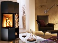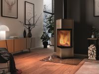 Piko L. est un foyer à bois de grande taille à quatre côtés avec des coins pointus et une fenêtre à deux faces qui révèlent les flammes.