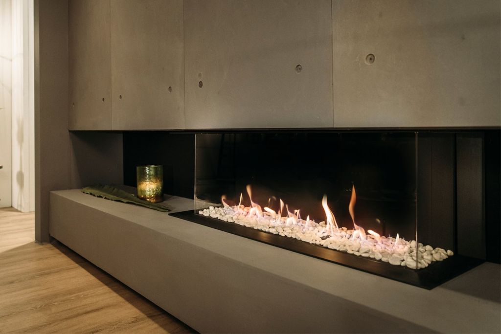 - Vous pouvez décorer les foyers linéaires avec un jeu de bûches réalistes, des galets de Carrare ou des éclats d’ardoise grise.