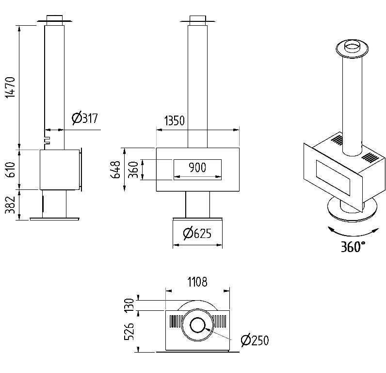 Ces poêles de format 16:9 Doté d’un pied circulaire peuvent être installer au beau milieu de la pièce et pivoter à 360° afin que vous puissiez profiter au maximum de la flamme. La hauteur d’installation maximum jusqu’au plafond est de 2,70 afin de permettre le poêle de pivoter, au dessus la position du poêle est fixe.