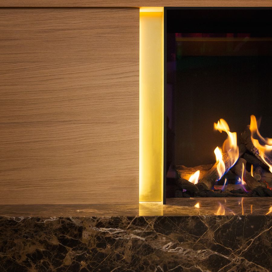 True Vision 850 V est une cheminée gaz verticale proposé en standard avec un fond en acier noir, une vitre en céramique et un jeu de bûche couplé avec des copeaux de charbons pour décorer le foyer.
