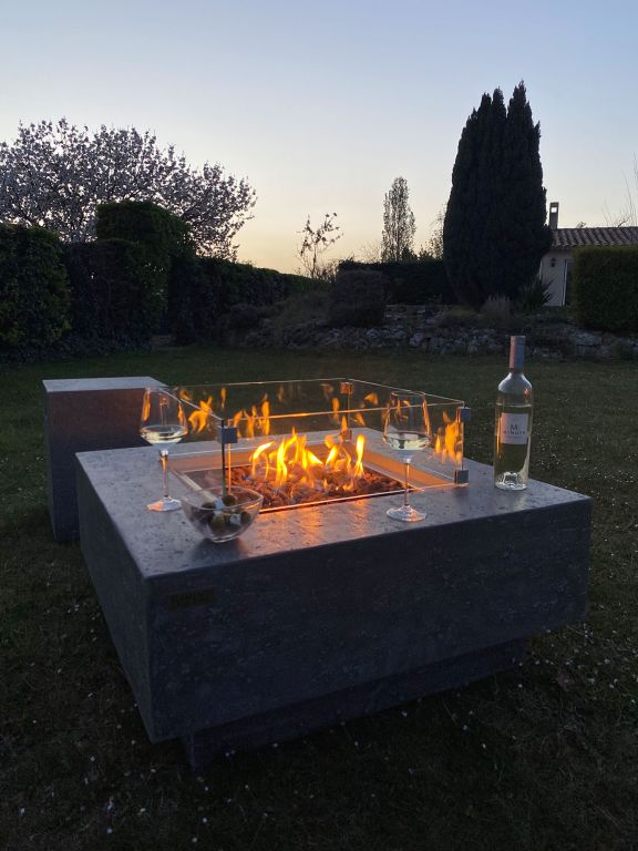Table basse avec cheminée au centre. Ce feu au gaz vous permet de créer une ambiance chaleureuse sur vos terrasses, jardins, pool-house...