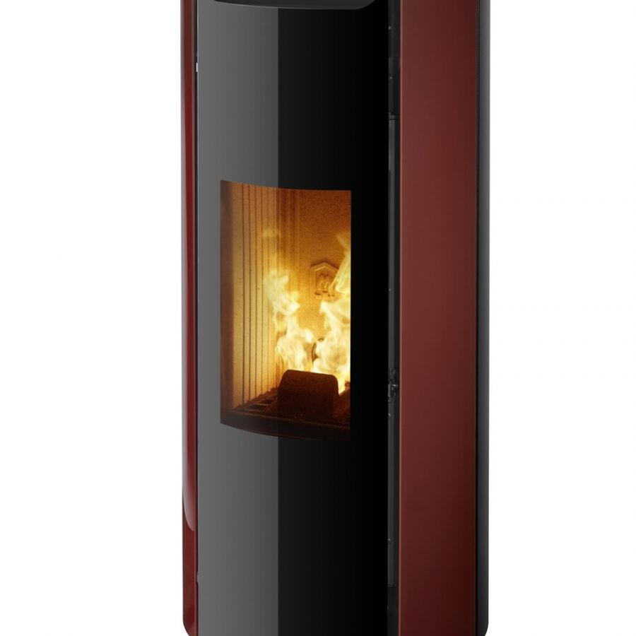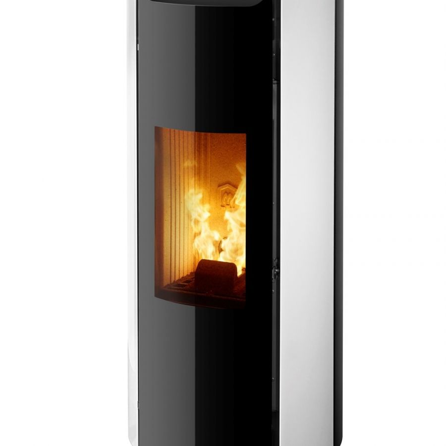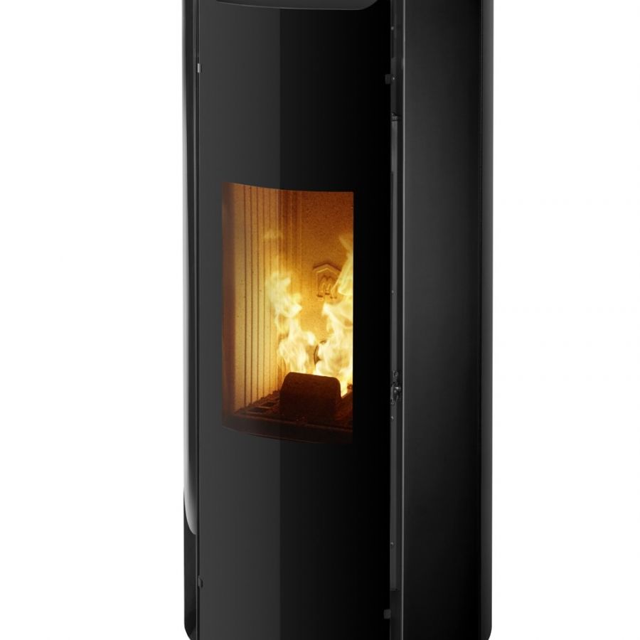 Poêle à granulés au design épuré sans grille de ventilation apparente.