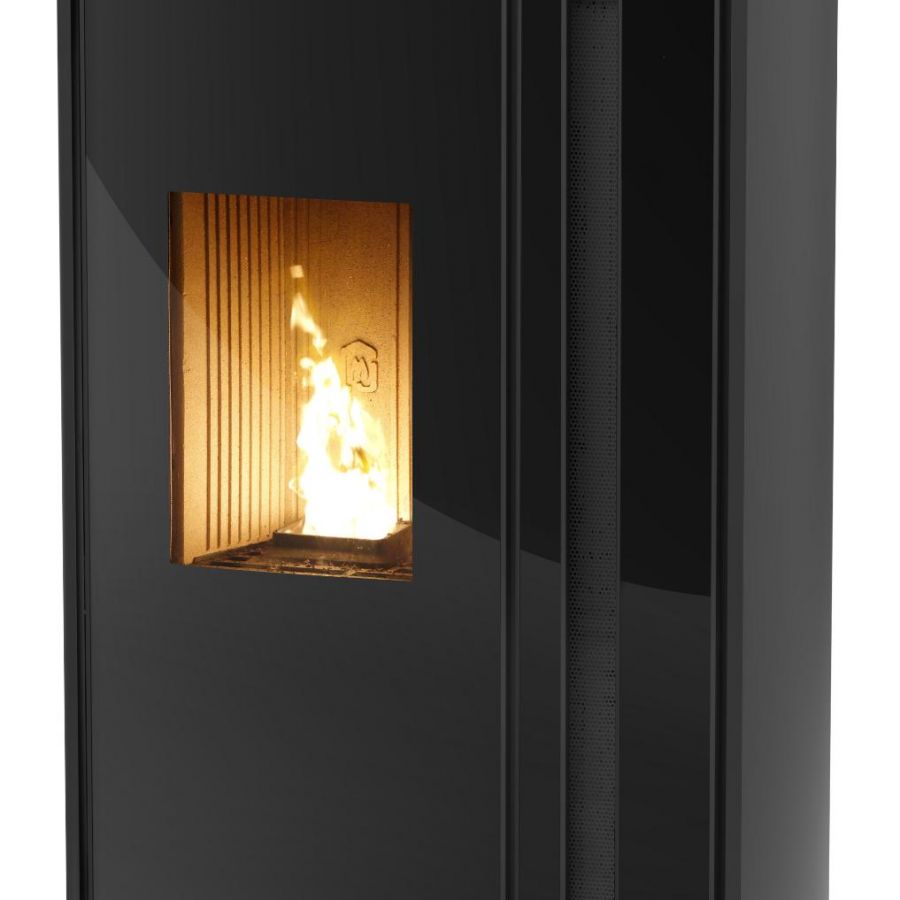 Le modèle de poêle à pellets Meltemi propose un système de soufflerie verticale, réglable et orientable.