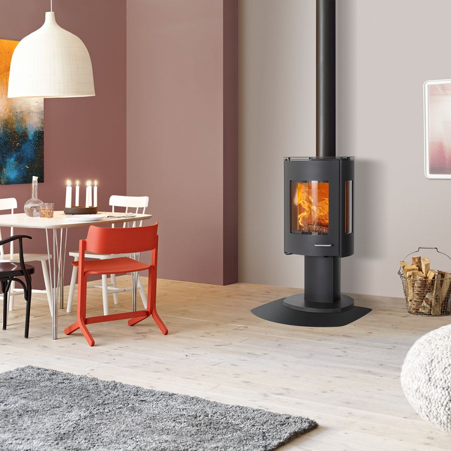 Découvrez le poêle à bois ILD 15 ECO, un modèle au design contemporain doté d'un élégant piétement piédestal.