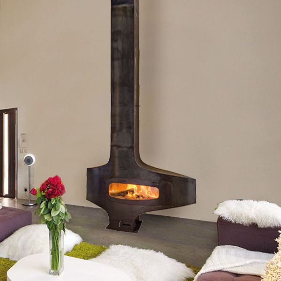 La cheminée peut fonctionner porte ouverte ou fermée, et le conduit en acier est réalisé sur mesure pour s'adapter à votre installation.