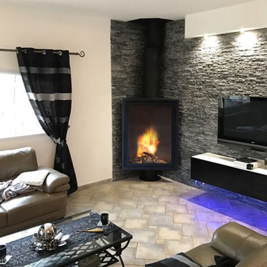 Ce modèle offre une vue panoramique sur les flammes, que ce soit en position centrale, en angle ou contre un mur plat.