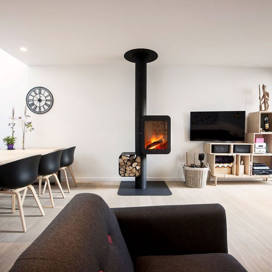 Le Grappus offre une vision panoramique des flammes, grâce à son design innovant qui intègre un présentoir à bois à proximité immédiate du foyer.
