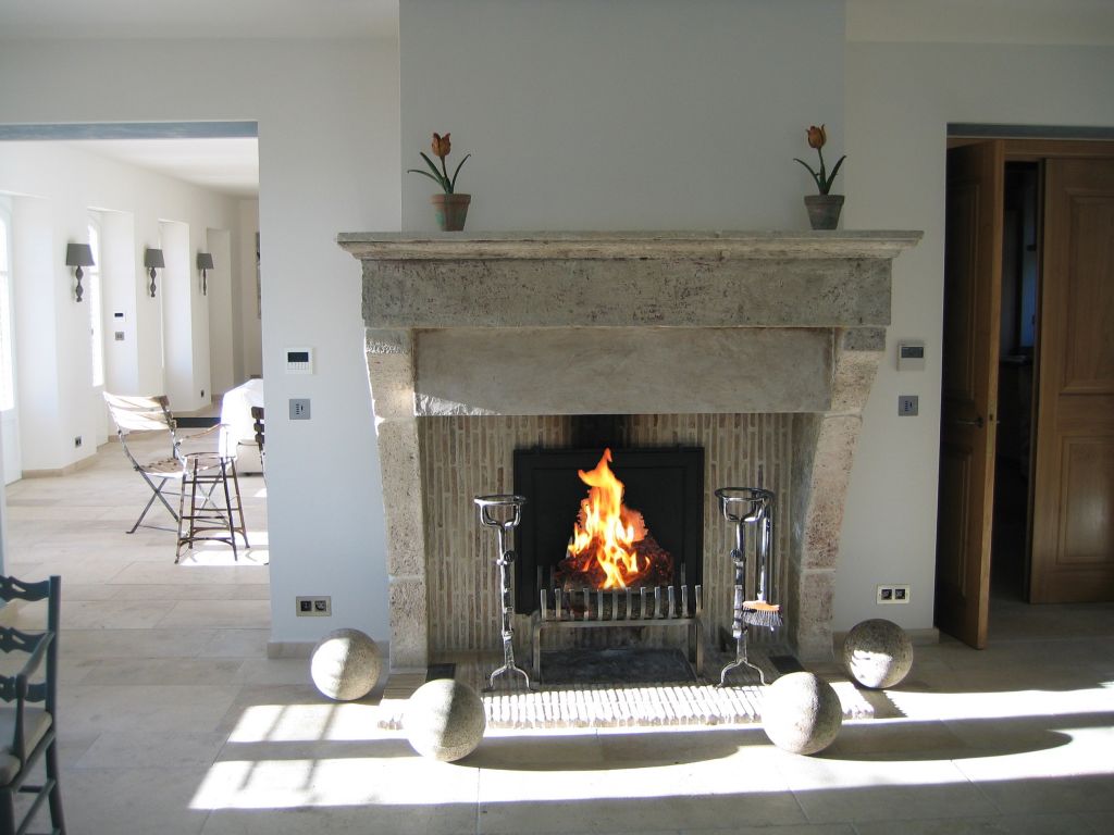 La cheminée se distingue également par une touche décorative originale : des boules de pierre disposées autour de l’habillage, qui apportent une note esthétique singulière et renforcent le caractère unique de cette réalisation.