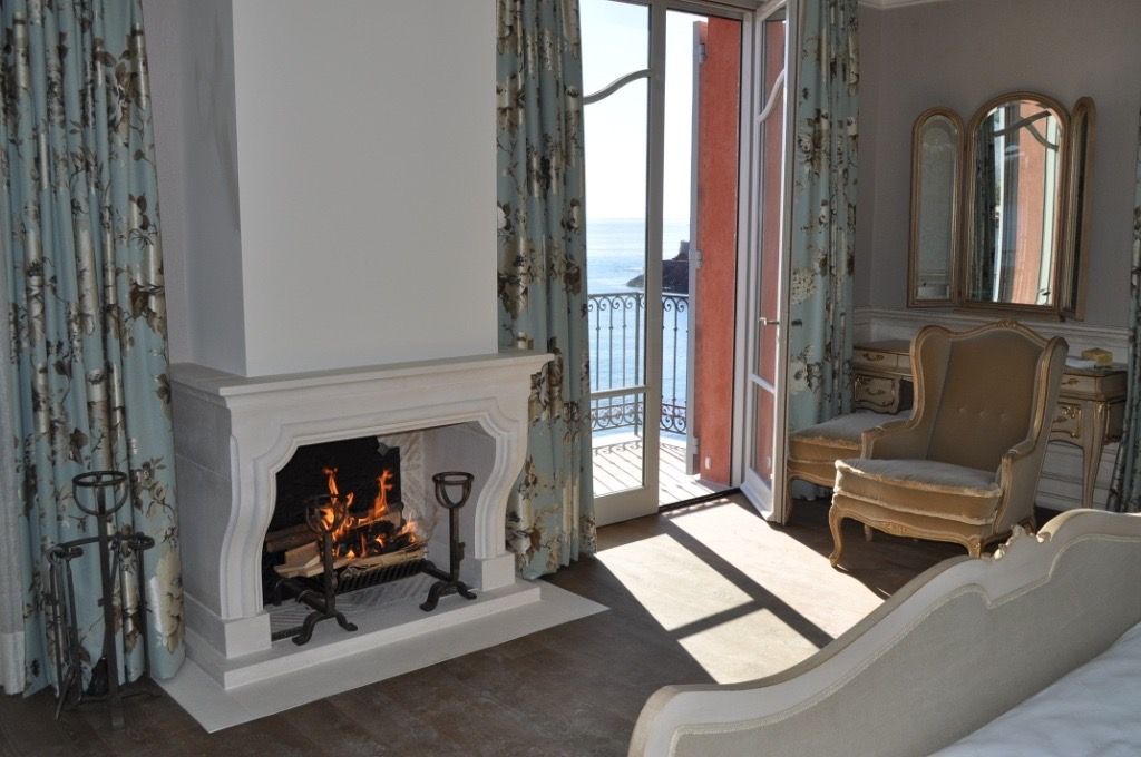 Cheminée en pierre blanche moderne avec foyer ouvert à bois – Alpes-Maritimes