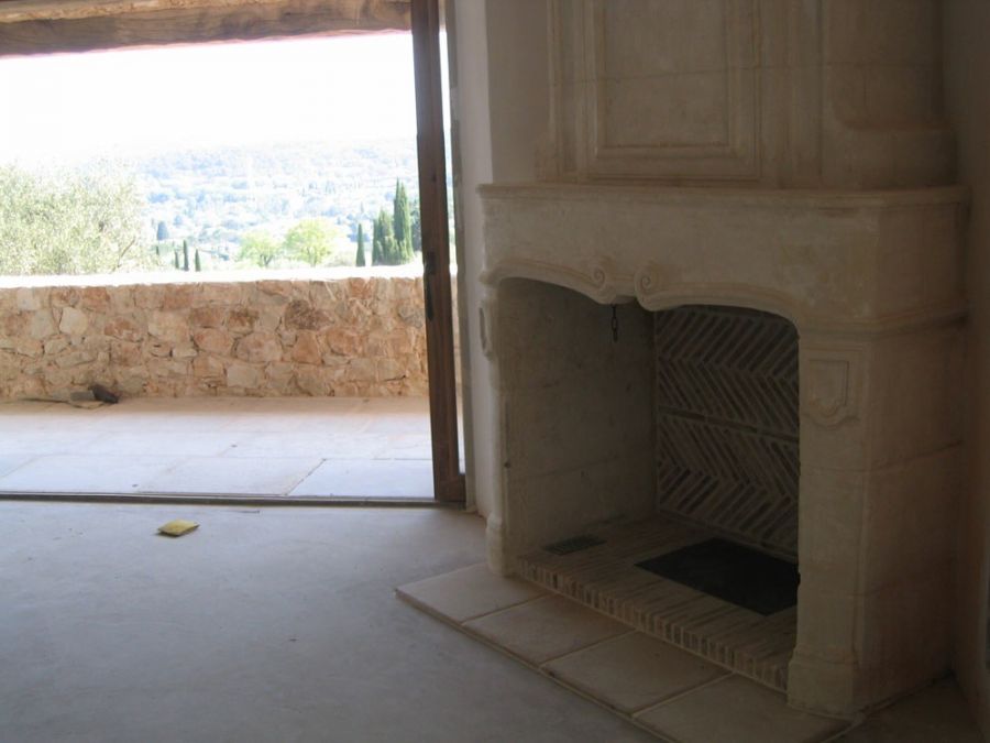 Cheminée en pierre beige style provençal avec foyer ouvert à bois – Alpes-Maritimes