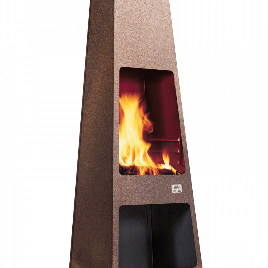 Une cheminée robuste en acier corten qui peut rester dehors en toutes saisons.